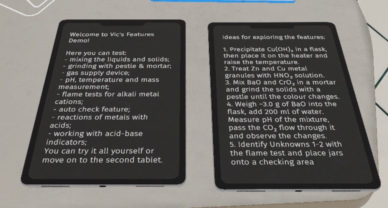 Can serve as a tutorial to get an overview and a first impression about the lab possibilities and try the main lab operations - mixing, measuring, conducting flame tests etc.